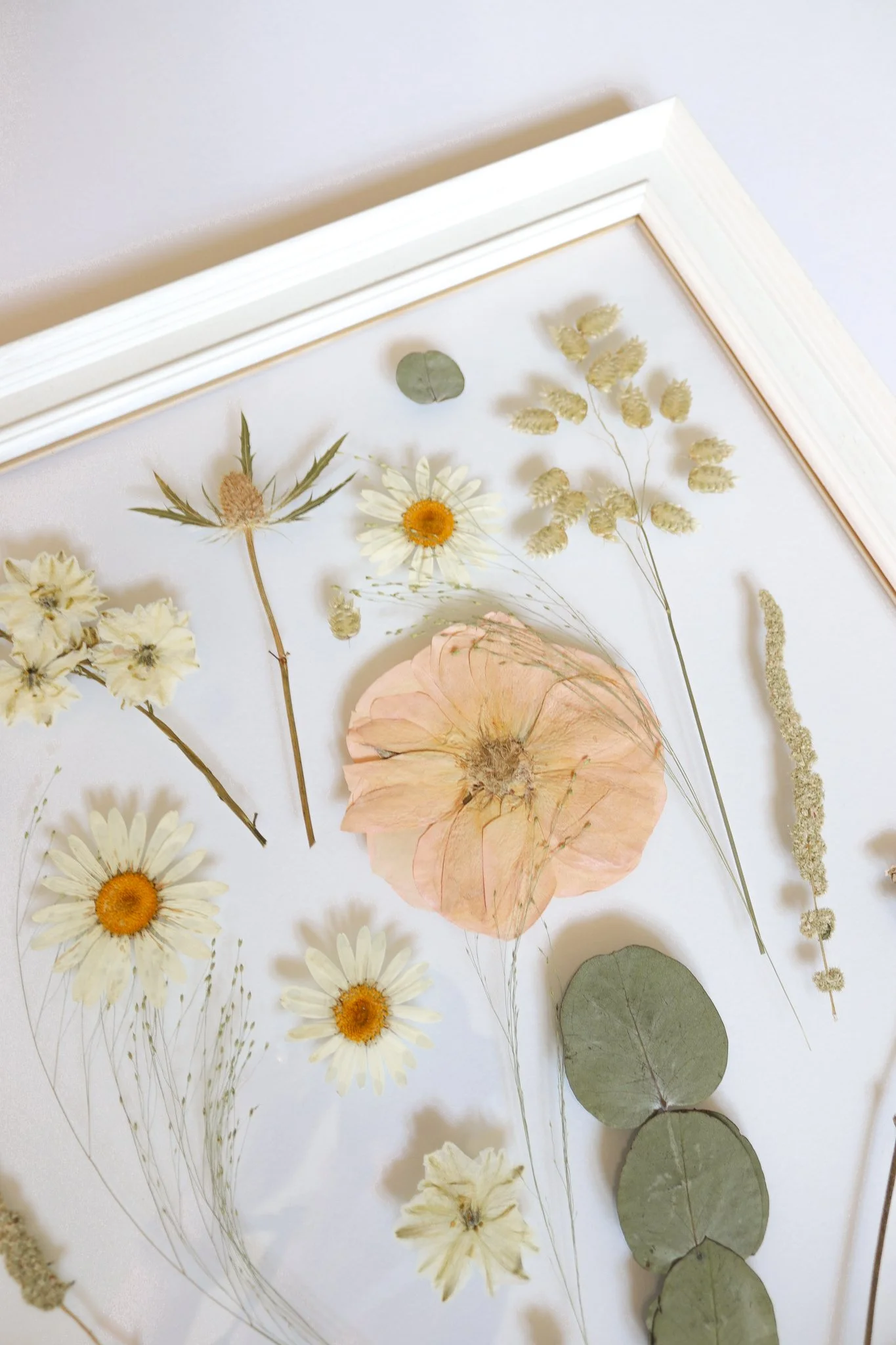 White flowers don’t often press as well as flowers with colour. However, if there is enough variety of flower types within your bouquet then the chances of your flowers pressing well are higher. Some white flowers press much better than others, and having a variety of different flowers of the same colour within a frame looks much better aesthetically.