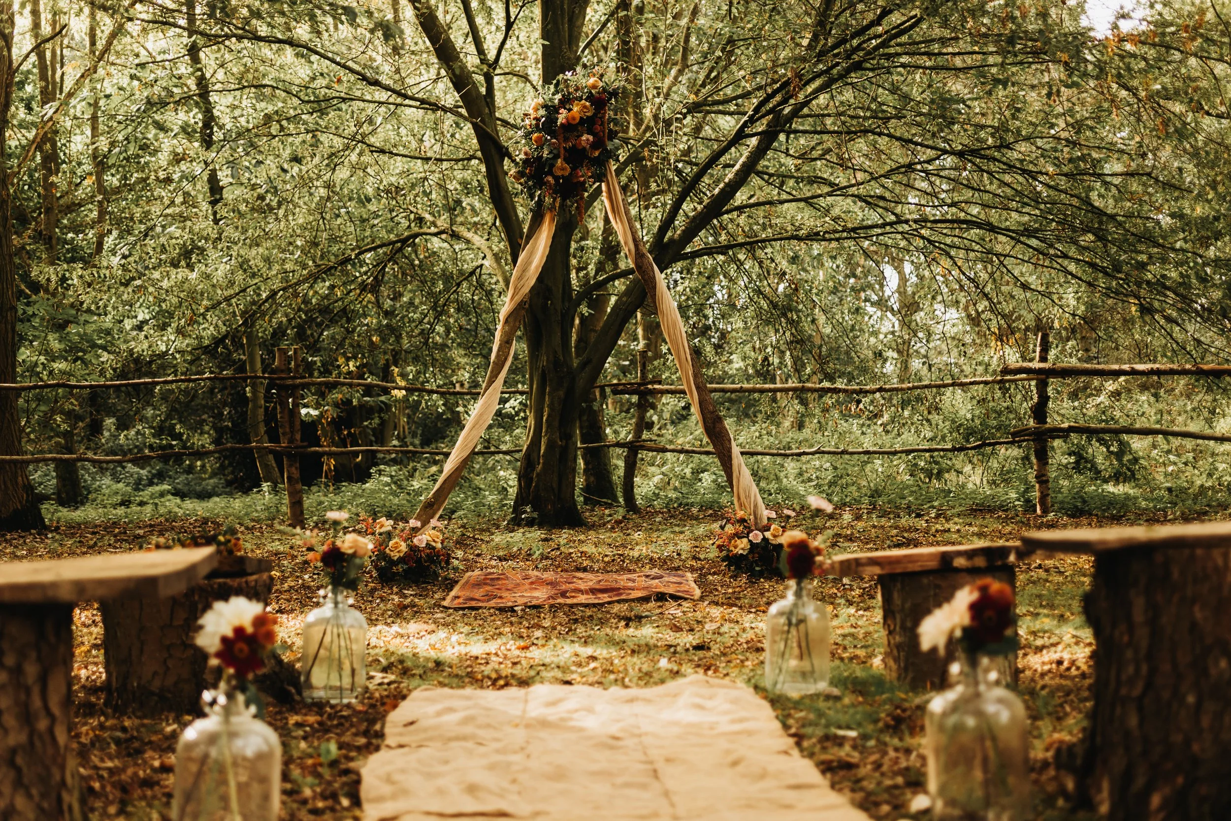 A ceremony setting that lives perfectly in the wood through the use of wood from the trees in the wood itself.