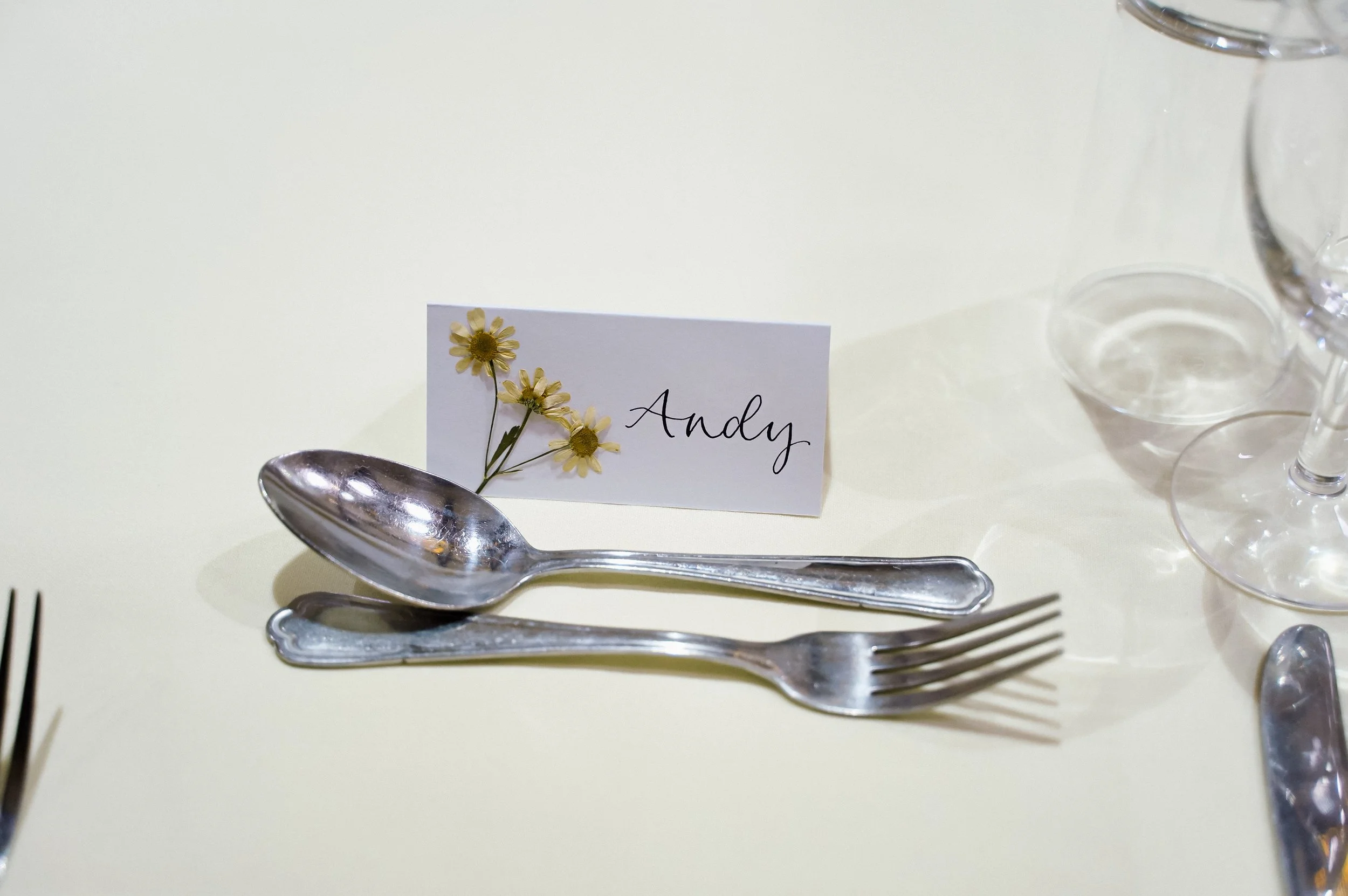 To continue the floral theme throughout the decor of their wedding, I created hand pressed flower table signage in collaboration with a local calligrapher, Blue Bell Lettering. I pressed flowers used within their wedding florals to match throughout. The place cards were a pleasant surprise for guests, and were taken home as cute favours (this wasn’t the intention, but the guests loved them!)