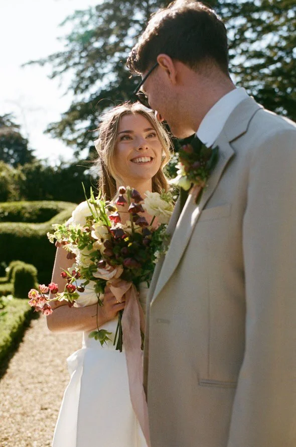 Together with Freya, founder of Freya Croisdale Weddings, we created a design that was inspirational for couples, but also felt real. Elegance and romance formed the core vision, documenting true emotion, refined design and styling, and wildly romantic florals. With mocha mousse as a base colour, we incorporated shades of muted pinks and pops of deep purple. Natural materials were used, from stoneware to muslin fabrics, to really bring nature into the design. Our selection of seasonal spring blooms, paired with a delicate earth-toned palette, ensured that the flowers enhanced the overall atmosphere.